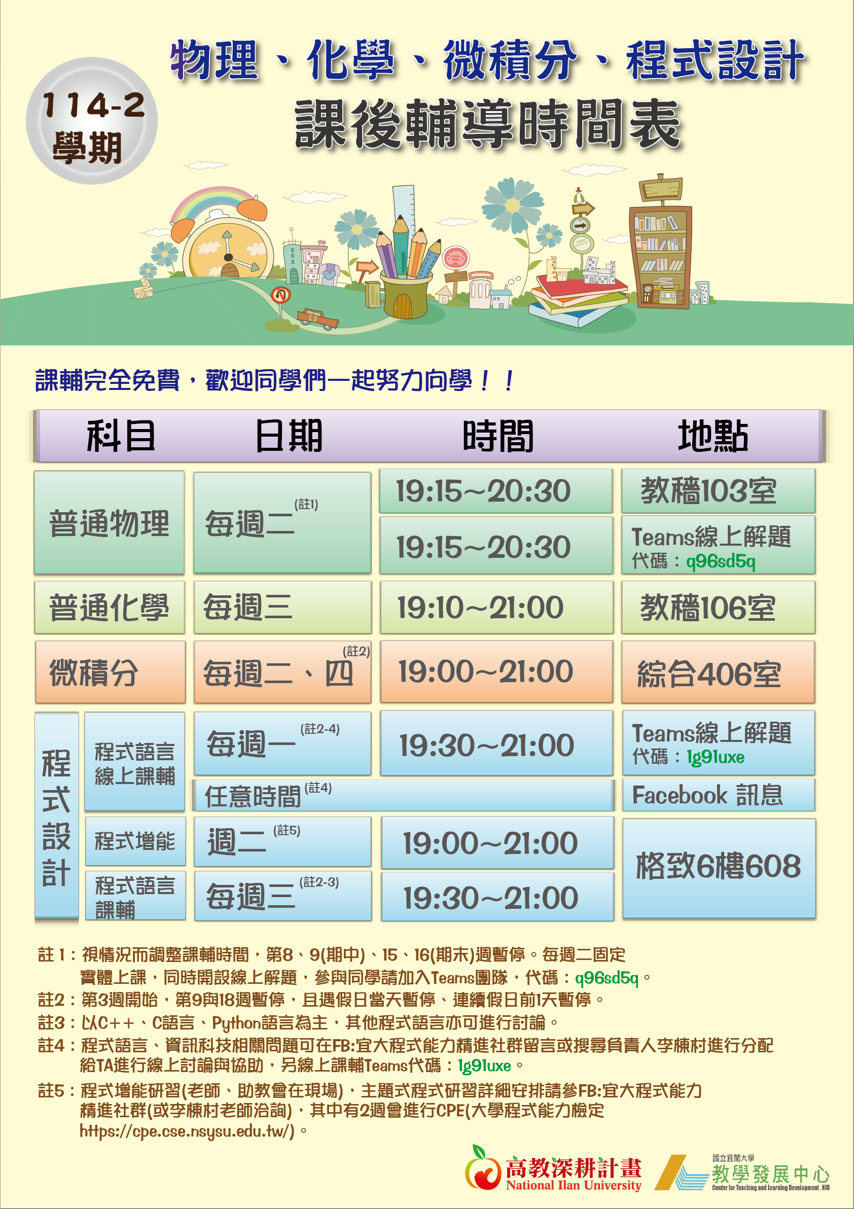 【高深分項二】114-2學期﹝物理、化學、微積分、程式設計﹞課後輔導時間,歡迎同學踴躍參加!!