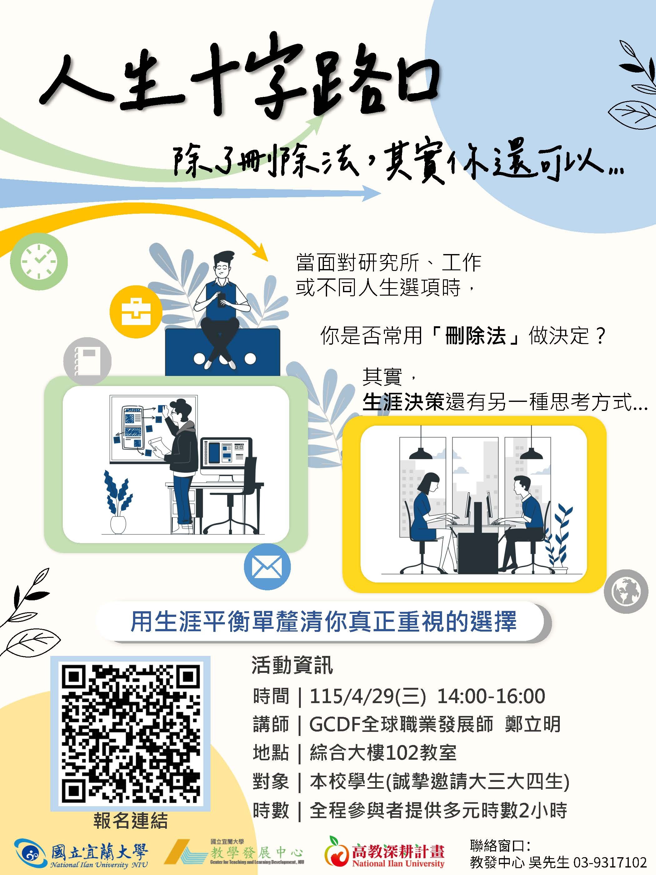 【高深分項二】115.04.29 「人生十字路口:除了刪除法,其實你還可以...」學習規劃講座,歡迎本校學生參加
